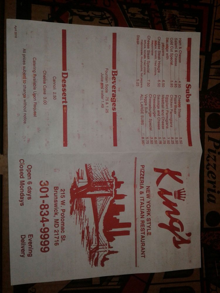 Introducing King's Pizza, located at 215 W Potomac St in Brunswick, MD, where pizza isn’t just food; it’s an experience. This charming, local pizzeria serves a diverse menu that extends beyond traditional slices. The array of pasta dinners, such as the Spaghetti with Meatballs and Fettuccine Alfredo, tantalizes the palate, while Italian entrees like Chicken Parmigiana and Eggplant Parmigiana offer hearty, flavorful options.